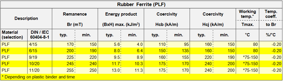 Rubber Ferrite is resistant to air, ozone, water vapor and weak acids / alkalis. The swelling or even the dissolution of the material may trigger by gasoline, mineral oil, acetone, benzene and chlorinated solvents. Rubber Ferrite bound with EPDM has a max. Operating temp. of 80°C, those with nitrile binder 100°C, in short term even 150°C.